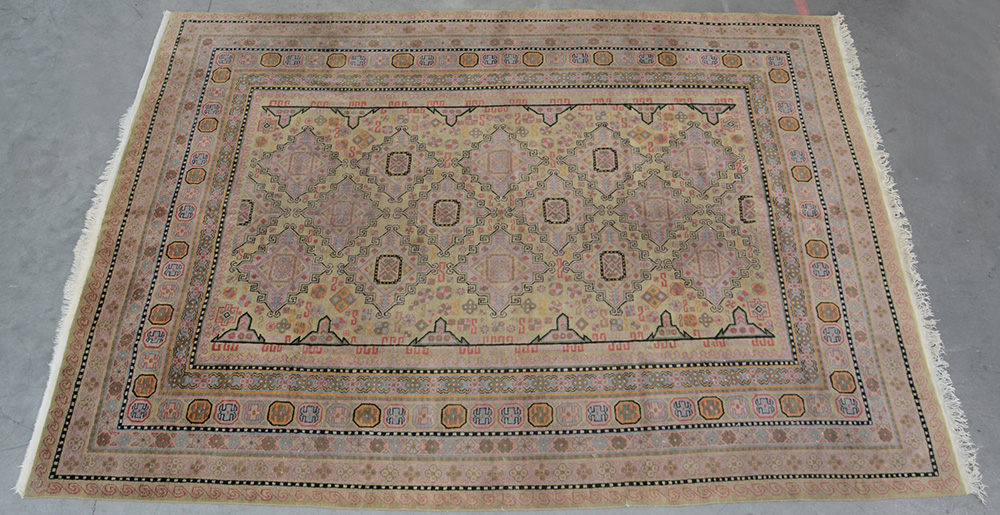 [Tappeti] Tappeto Samarkanda, sec. XX. Disegno geometrico con Gul uncinati nei toni del verde chiaro, rosa, azzurro e nero (cm 366x265) (difetti)