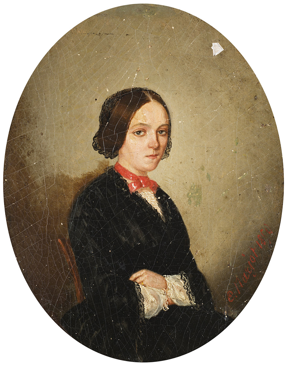 "Ritratto di giovane assisa" olio su cartone pressato (cm 23x19) Firmato e datato 1850 in basso a destra. In cornice (difetti)