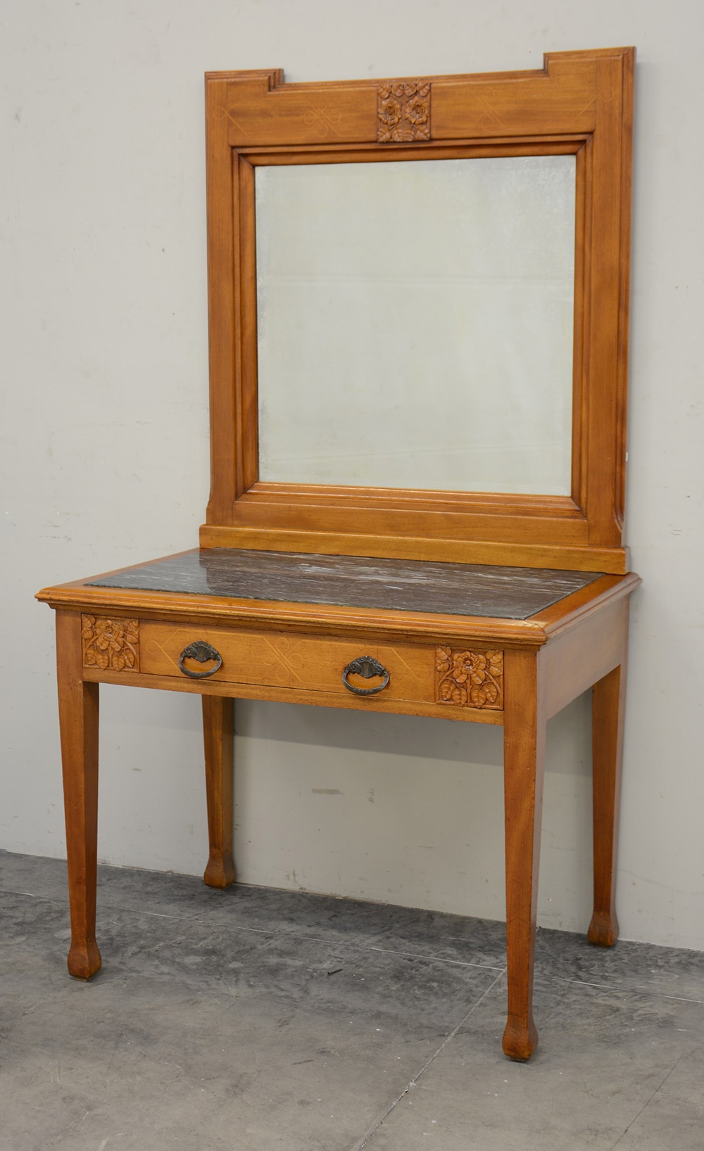 Toelette con specchiera ad un cassetto nella fascia, in legno intagliato a fiori e foglie e filettato a motivi geometrici, piano in marmo. 1910 ca. (Cm 96x172x62)(difetti)