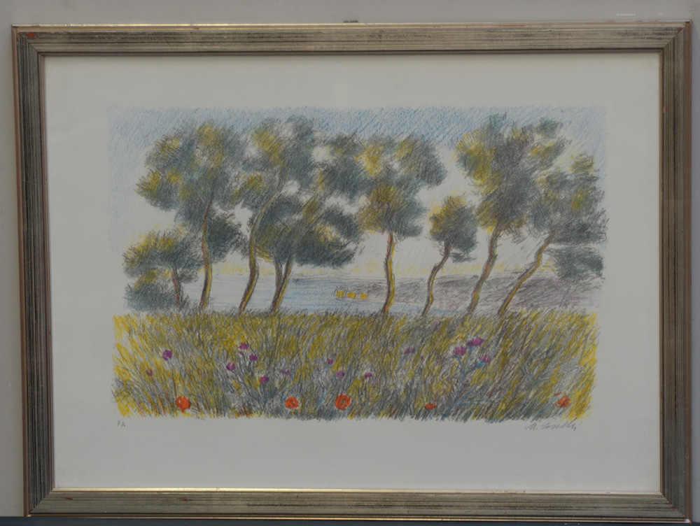 "Paesaggio mediterraneo" Litografia prova d'artista a colori (cm 50x70) firmata in basso a destra, in cornice
