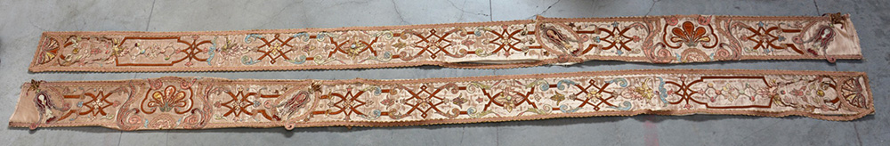 [Tappeti] Due strisce decorative in raso di seta bianca con applicazioni in velluto e fili metallici in policromia. Motivi ispirati alle bordure rinascimentali (difetti)