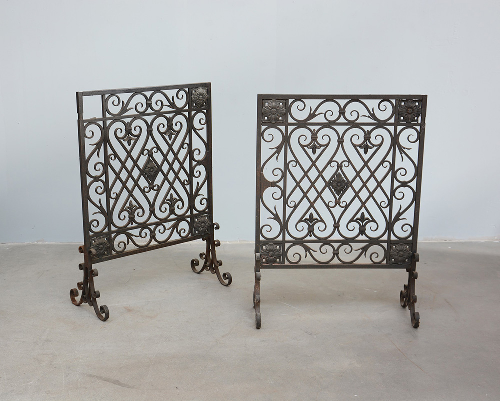 Coppia di ringhiere in ferro battuto. Gamba decorata a volute e fiori stilizzati; primi decenni del secolo XX (cm 71x100x33) (difetti)