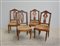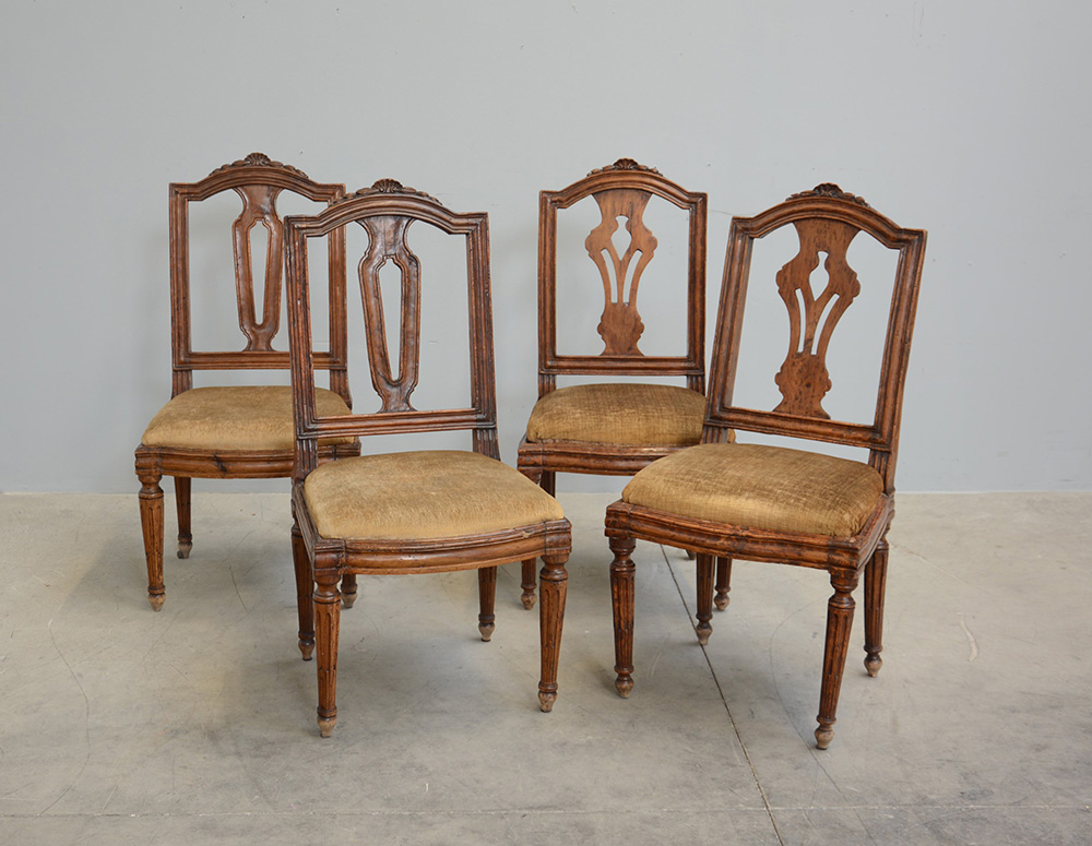 Gruppo di quattro sedie con schienale a giorno e cartella traforata. Piedi torniti e scanalati