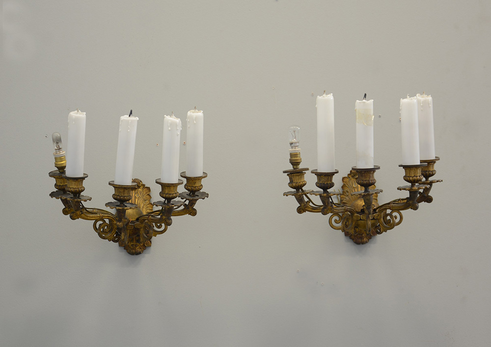 Coppia di appliques a cinque fiamme in bronzo dorato decorato a motivi vegetali e volute. Fine secolo XIX