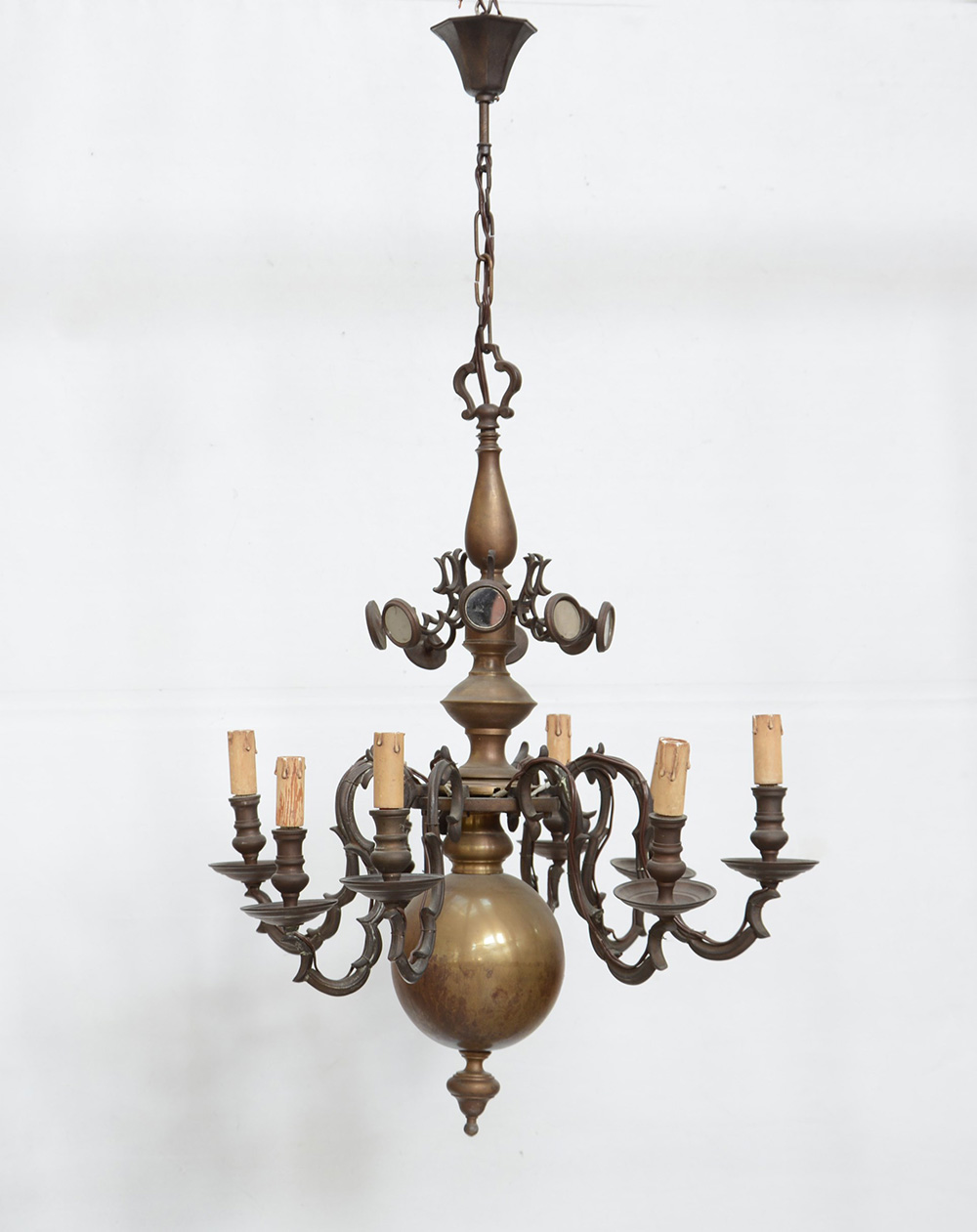 Antico lampadario olandese in bronzo a otto luci, parte superiore decorata a specchiature tonde (h cm 86) (Difetti)