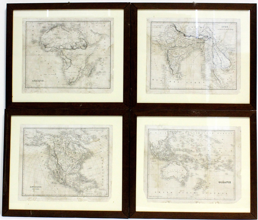 Gruppo di quattro incisioni del secolo XIX raffiguranti carte geografiche dell’America, Africa, Oceania e India, pubblicate a Parigi da Jules Renouard (28x22,5 circa) in cornici (difetti)