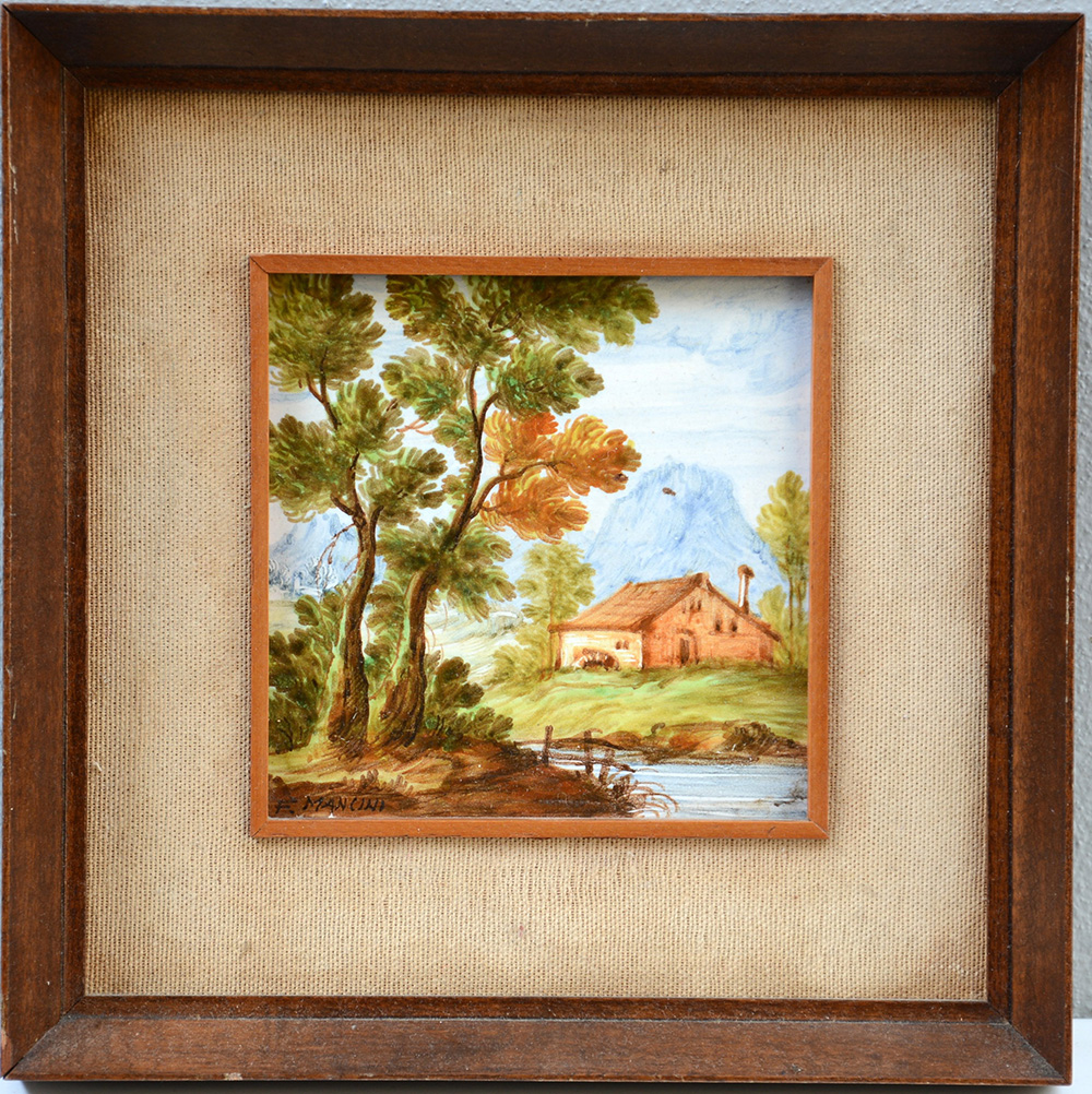 Piastrella dipinta raffigurante un paesaggio fluviale con casolare (cm 15x15) firmata Mancini in basso a sinistra, in cornice (difetti alla cornice)