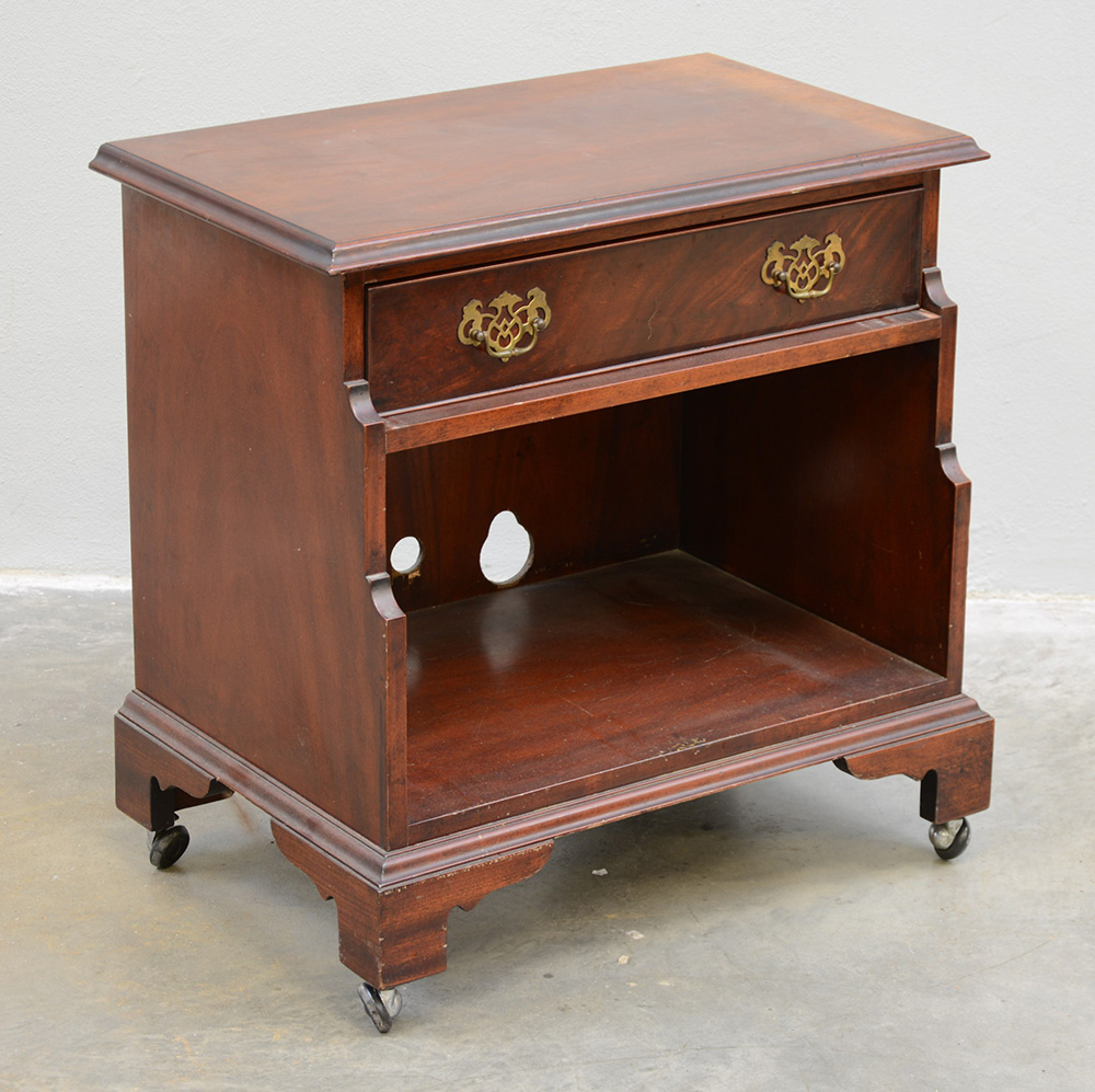 Comodino in mogano a un cassetto nella fascia e vano a giorno. Piedi sagomati terminanti con rotelle (cm 66x65x39)