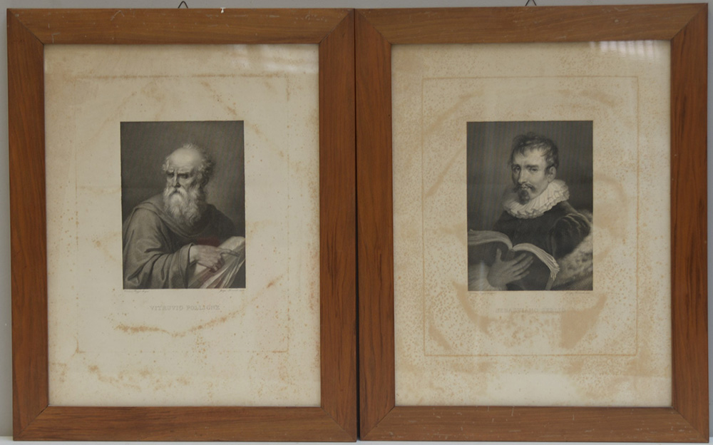 Coppia di incisioni raffiguranti ritratti di Sebastiano Serlio e Vitruvio Pollione (cm 48x36) in cornici (difetti)