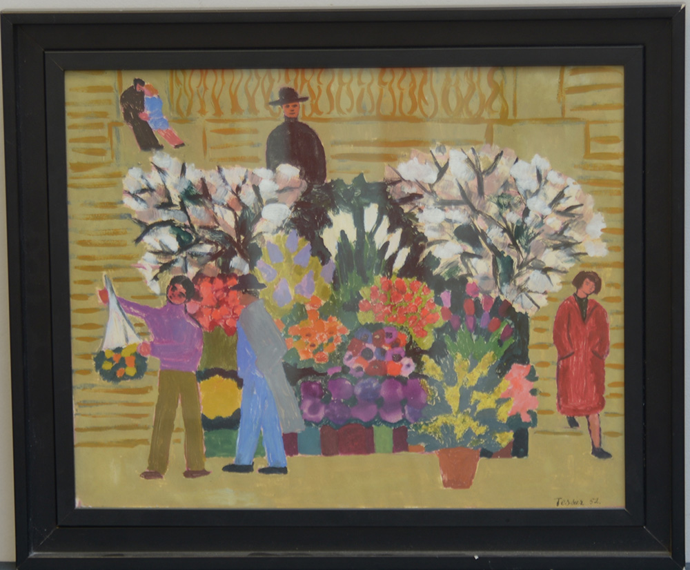 "Bancarella di fiori con personaggi" tecnica mista su cartoncino (cm 36x43) firmata in basso a destra e datata 1952, in cornice
