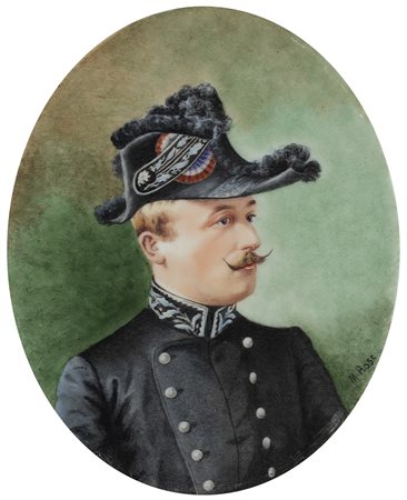 Art of the 19th century "Portrait of a diplomat with bicorne hat" on oval polychrome porcelain plate (cm 20x16,5) Signed M Bosg lower right. Framed