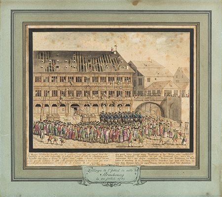 Watercoloured engraving of the 18th century titled "Pillage de l'Hotel de ville de Strasbourg" (cm 32x37) Framed (defects)