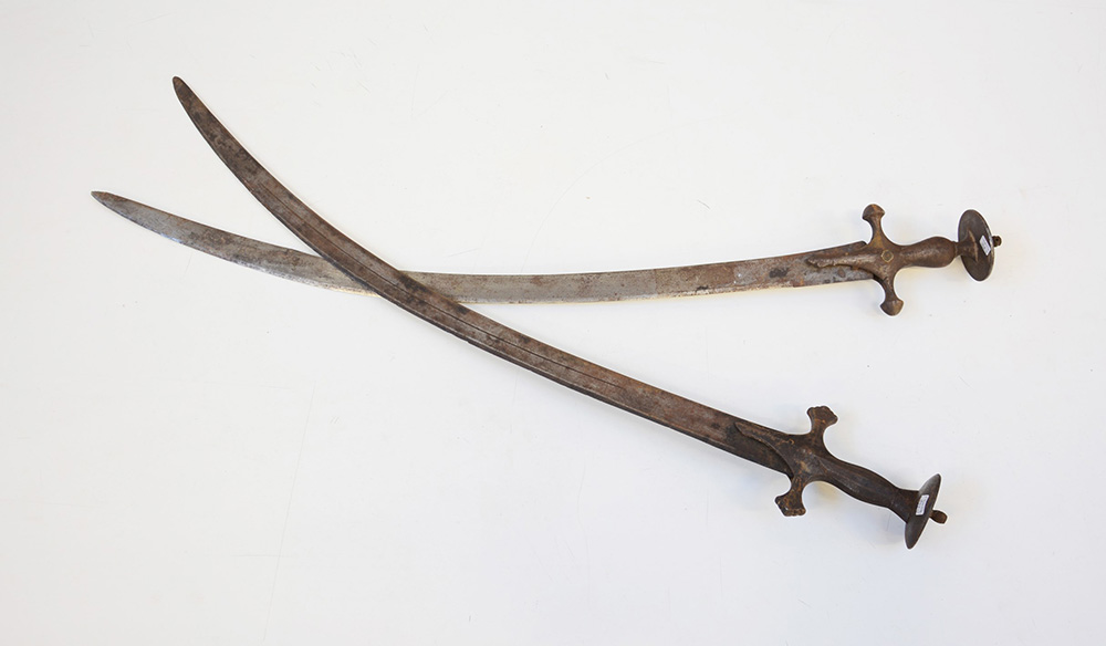 Due tulwar, scimitarre indiane, seconda metà sec. XIX. Impugnatura in ferro con codolo a disco e guardia a T, lame fortemente arquate ad un filo (l max 88 cm) (difetti)