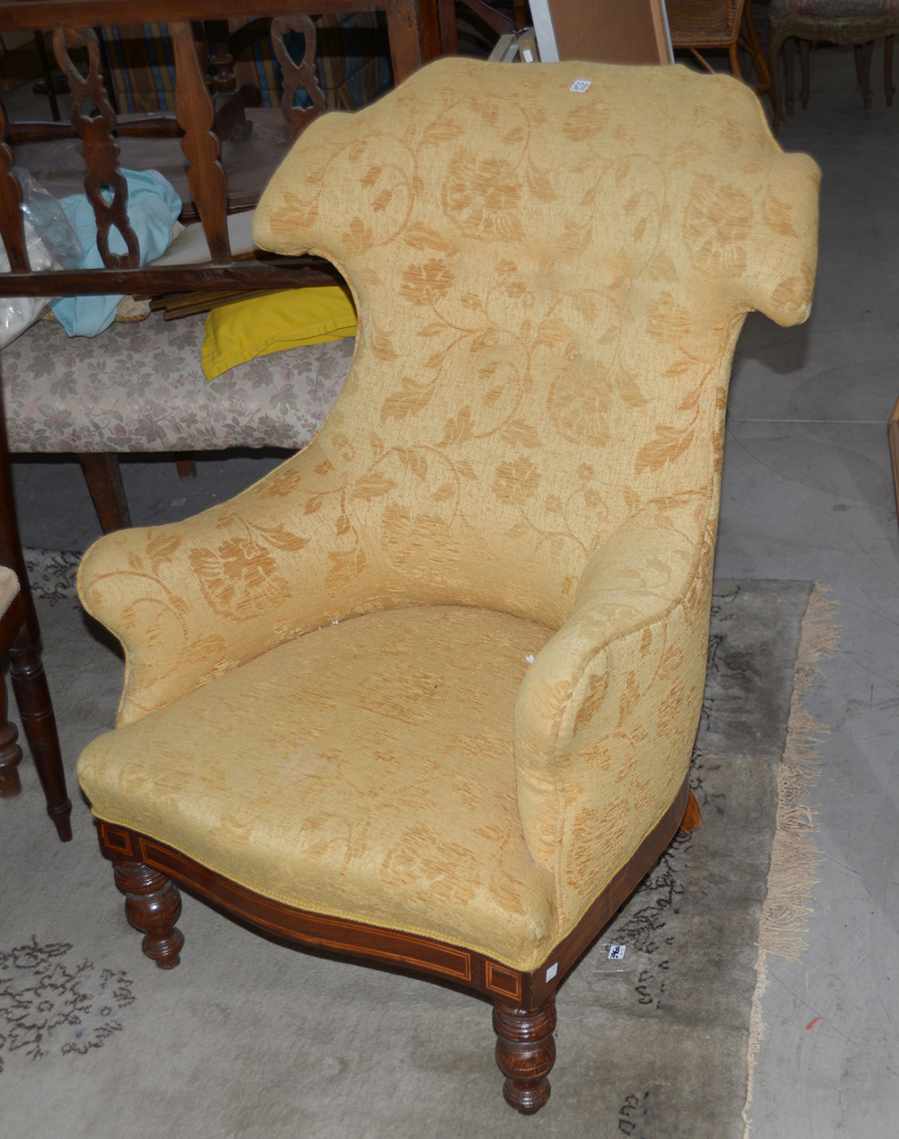 Poltrona con schienale e braccioli sagomati, fascia anteriore filettata in legno chiaro, gambe tornite. Sec. XIX