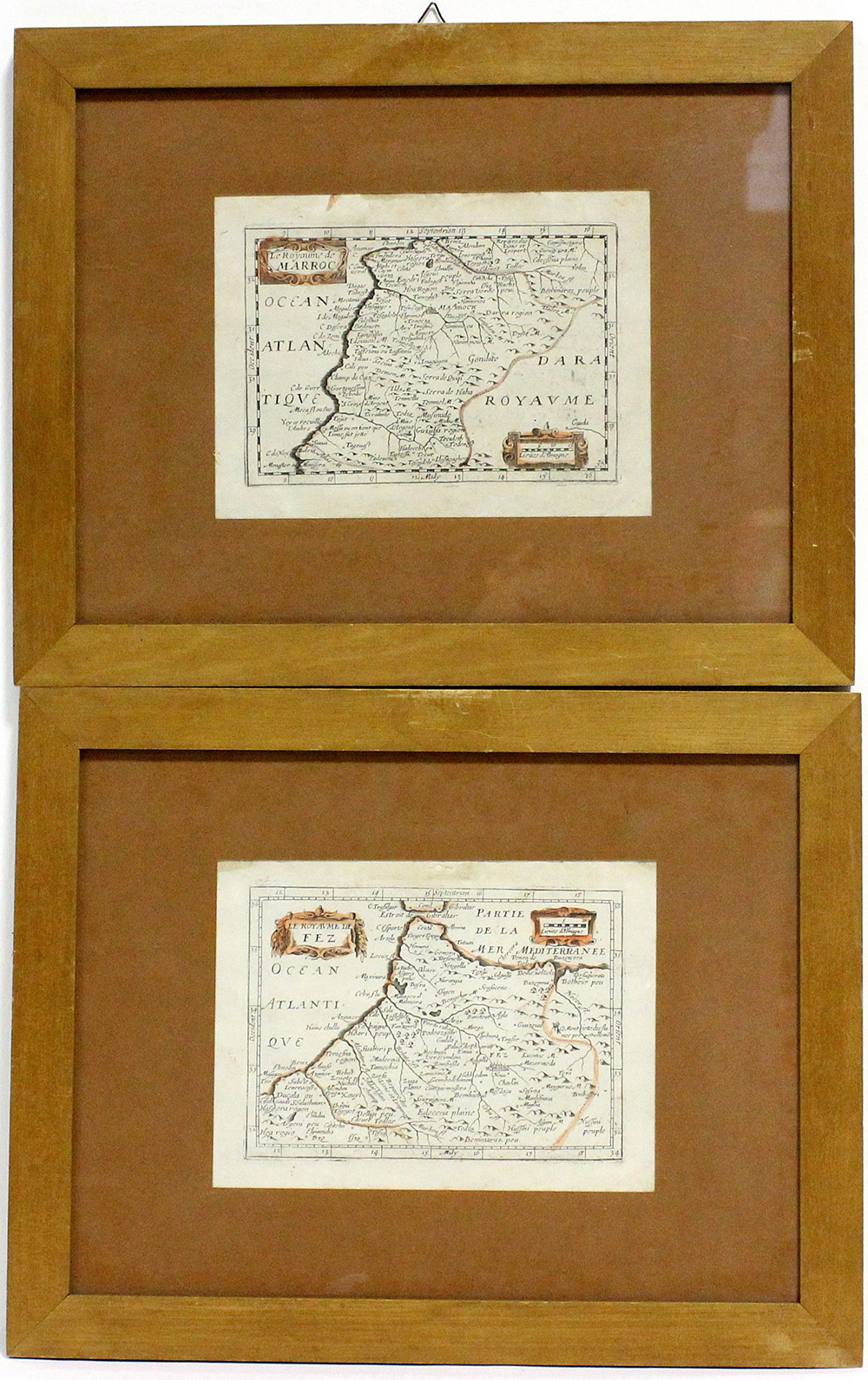 Coppia di incisioni del secolo XVII illustranti "Le royaume de Fez" e "Le royaume de Marroc" parzialmente acquerellate (battute cm 18x13 circa) in cornici (difetti)