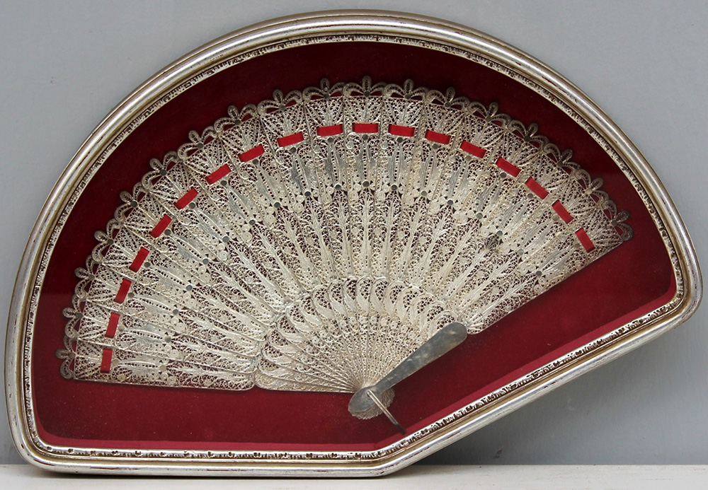 Ventaglio con stecche in metallo argentato lavorato a filigrana, in cornice