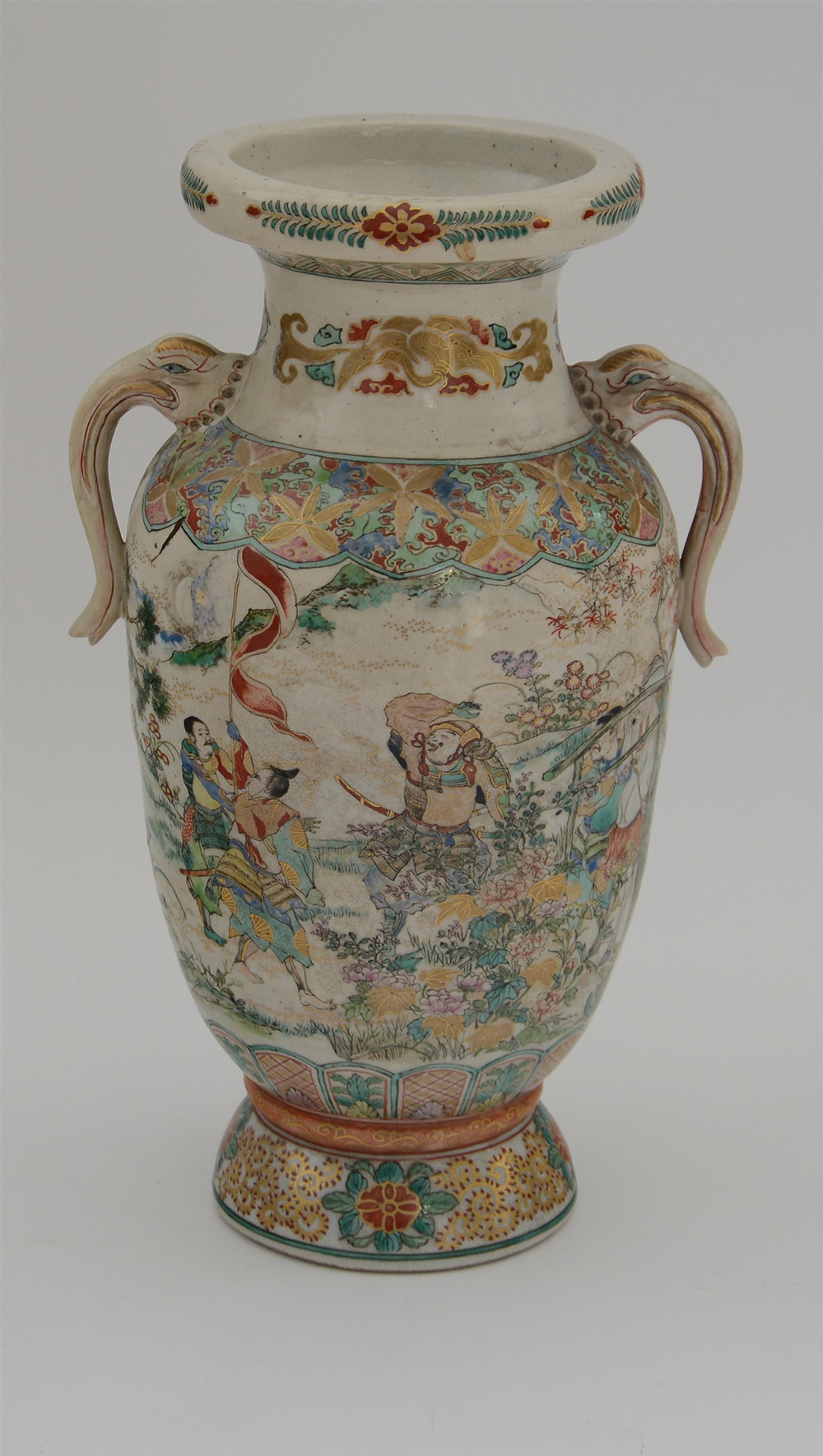 Vaso in porcellana policroma con doppie anse elefantine decorato con scene di vita (difetti)