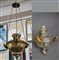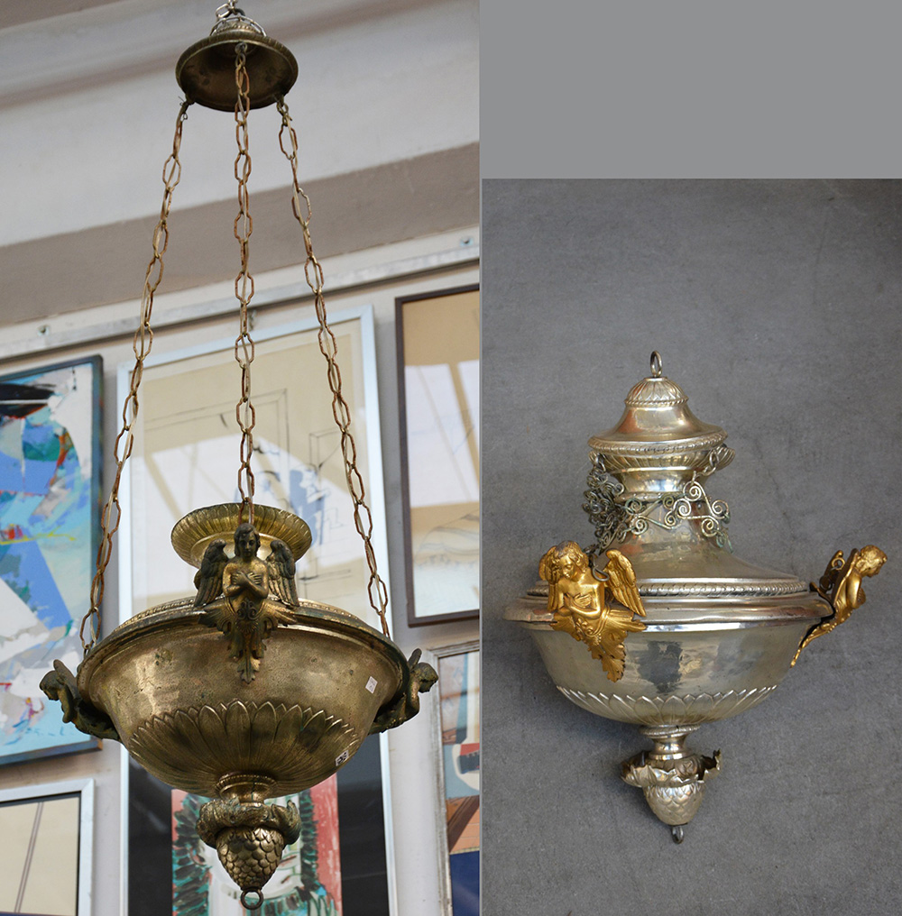 Coppia di lampadari in rame argentato decorate con figure di angeli dorati a tutto tondo. Sec. XIX (difetti e mancanze)