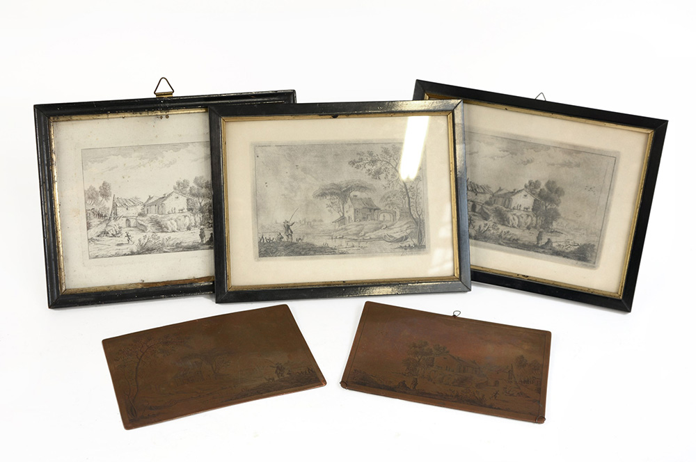 Lotto di tre incisioni raffiguranti paesaggi con relative lastre in rame incise
