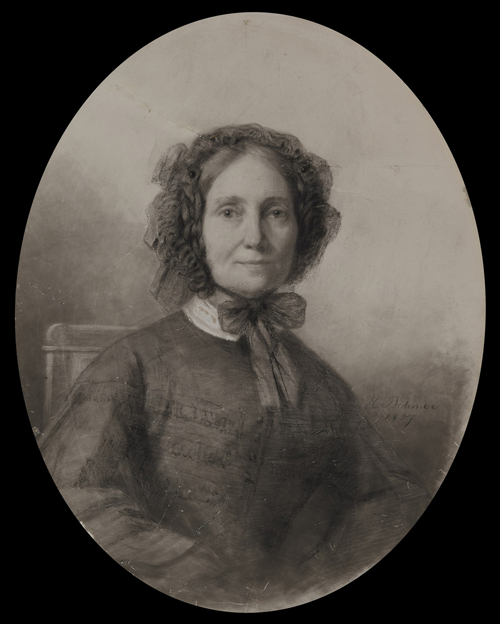 "Portrait of an Elderly Woman with Dark Dress and Toque" pencil on oval paper. Signed and dated 1857 to right (cm 29x19) Framed (defects)