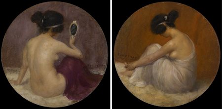 "Femmes à la Toilette" pair of oils on round cardboard. Signed (d cm 21) Framed (defects)