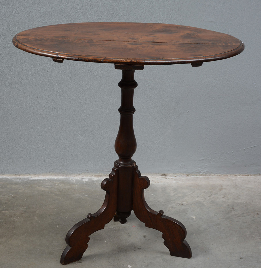 Tavolino tripode con piano ovale e gamba centrale tornita (cm 78x76x53) (difetti)