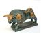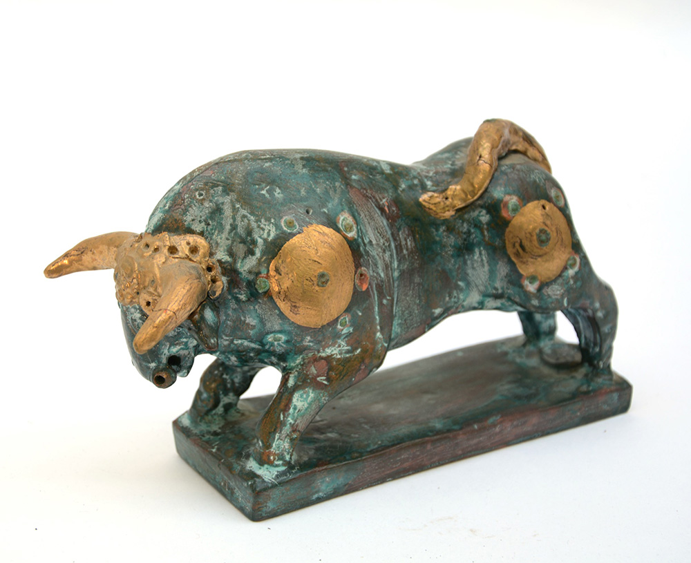 Arte del Sec. XX "Toro" scultura in terracotta smaltata in policromia e doratura (h cm 14). (difetti e restauri)