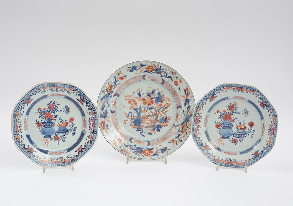 Tre piatti in porcellana Imari, uno di forma rotonda e due ottagonali