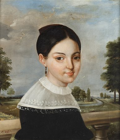 Ignoto, sec. XIX "Fanciulla in un paesaggio" olio su tela (cm 47,5x42) Siglato e datato C. 1837 in basso a sinistra. In cornice (difetti e restauri)