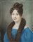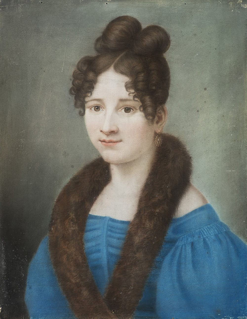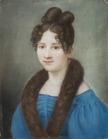 Scuola del sec. XIX "Ritratto di gentildonna in veste azzurra con sciarpa di pelliccia" pastelli colorati su pergamena (cm 50x39) In cornice in legno dorato con perlinature (difetti)