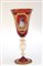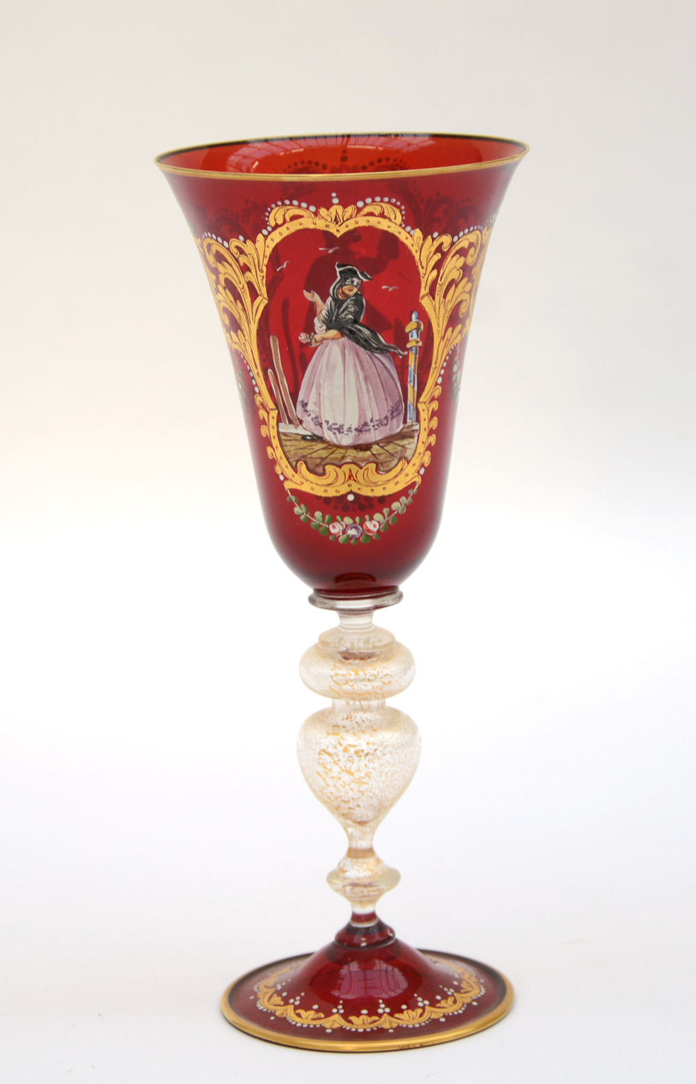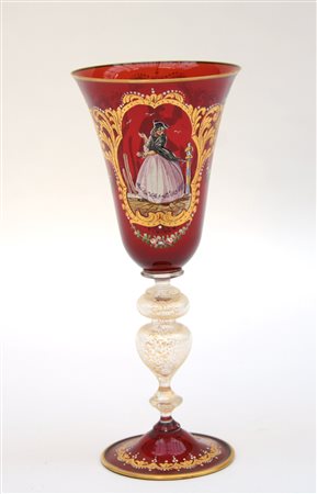 Manifattura di Murano del secolo XX, bicchiere in vetro trasparente con inclusioni di foglia d'oro e rosso rubino decorato a motivi vegetali in oro ed in policromia a festoni e figure in maschera (h cm 24)