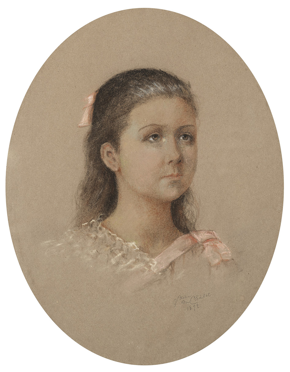 Firma indecifrata "Ritratto di fanciulla in rosa" pastello su carta (cm...