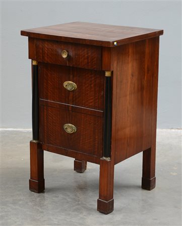 Comodino lastronato in noce con fronte ad un cassetto e ad un'anta simulante due cassetti, montanti a mezza colonna tornita ed ebanizzata con capitelli in metallo dorato, piedi a pilastro. Secolo XIX (cm 57x92x49)(difetti e restauri)