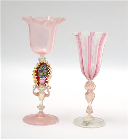 Manifattura di Murano Sec. XX, lotto di due bicchieri in vetro soffiato rosa, trasparente con striature bianche, inserti di foglia d'oro, uno decorato con murrine