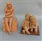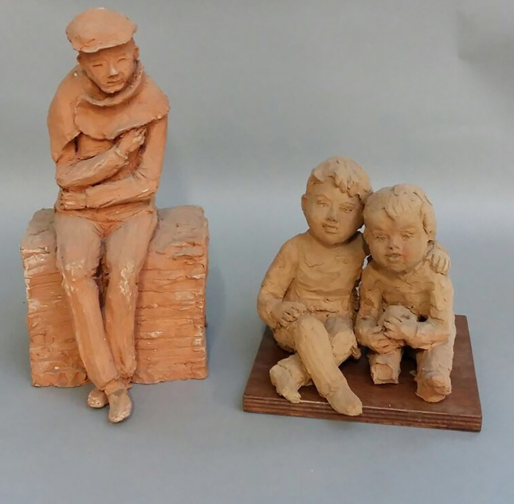 Lotto di due sculture raffiguranti un uomo seduto e due fanciulli abbracciati (h max cm 41) (difetti)
