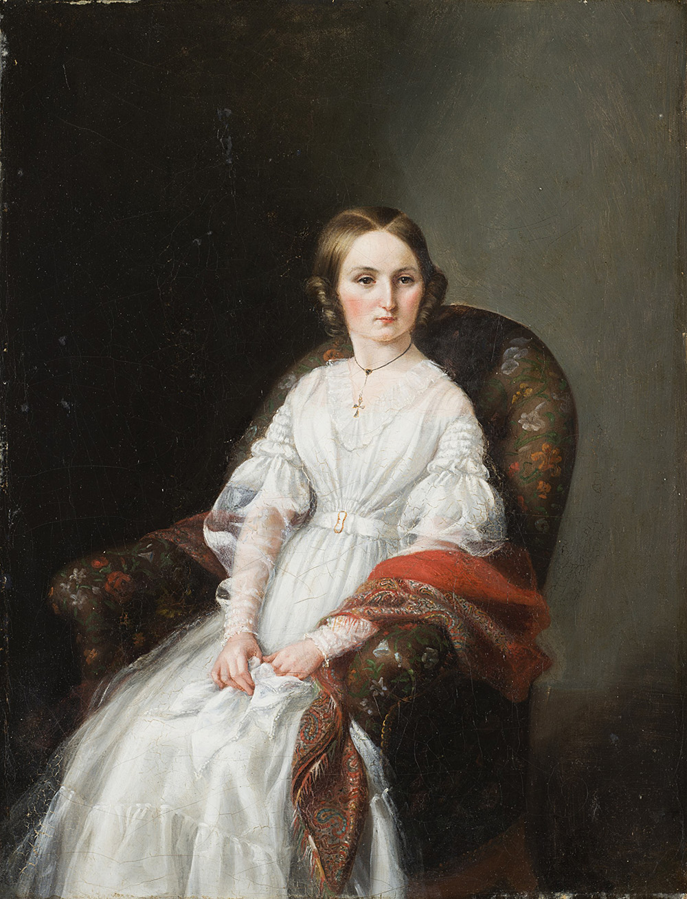 School of the 19th century "Portrait of a Lady in a White Dress" oil on canvas (cm 36x28) Framed (defects)