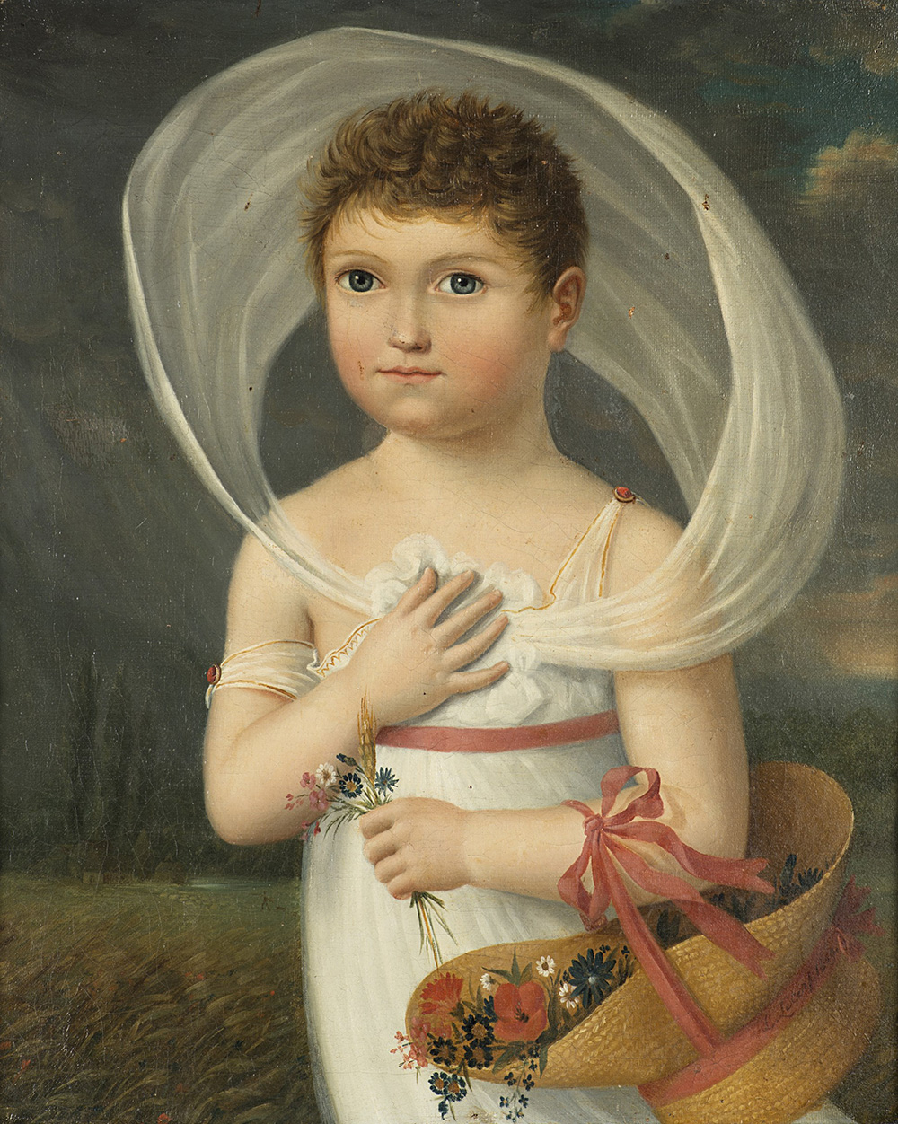 Scuola del sec. XIX "Figura di fanciulla con fiori" olio su tela (cm 55x44) Firmato e datato 1869 in basso a destra. In cornice (difetti e restauri)