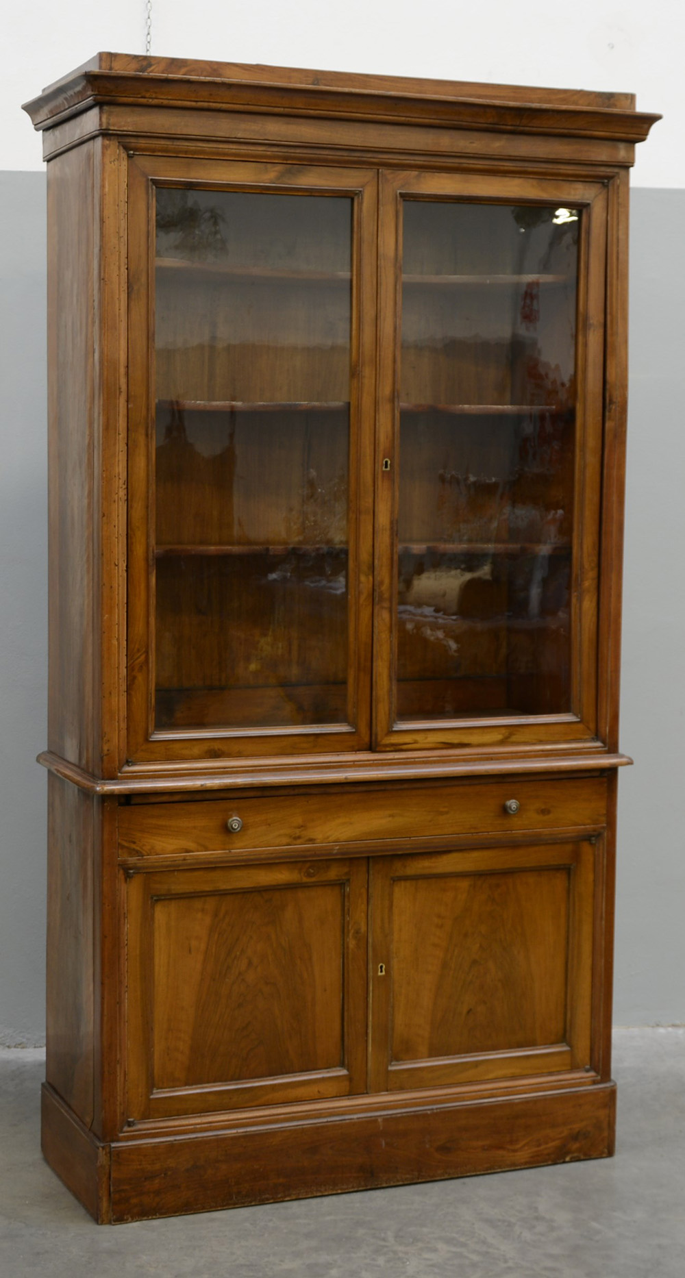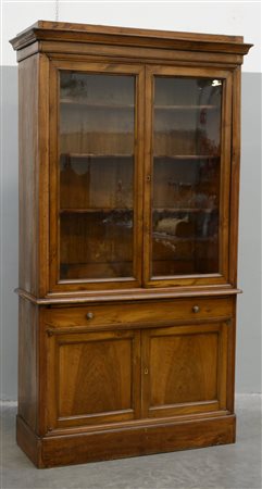 Vetrina a due corpi in noce, parte superiore a due ante a vetri e parte inferiore ad un cassetto e due ante riquadrate. Fine sec XIX, (cm 120x210x 43) (difetti)