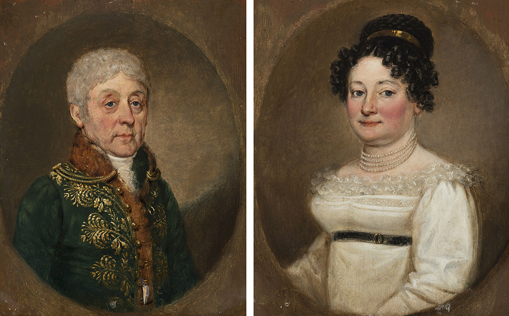 Scuola del sec. XIX "Ritratto di gentiluomo e gentildonna" coppia di olii su...