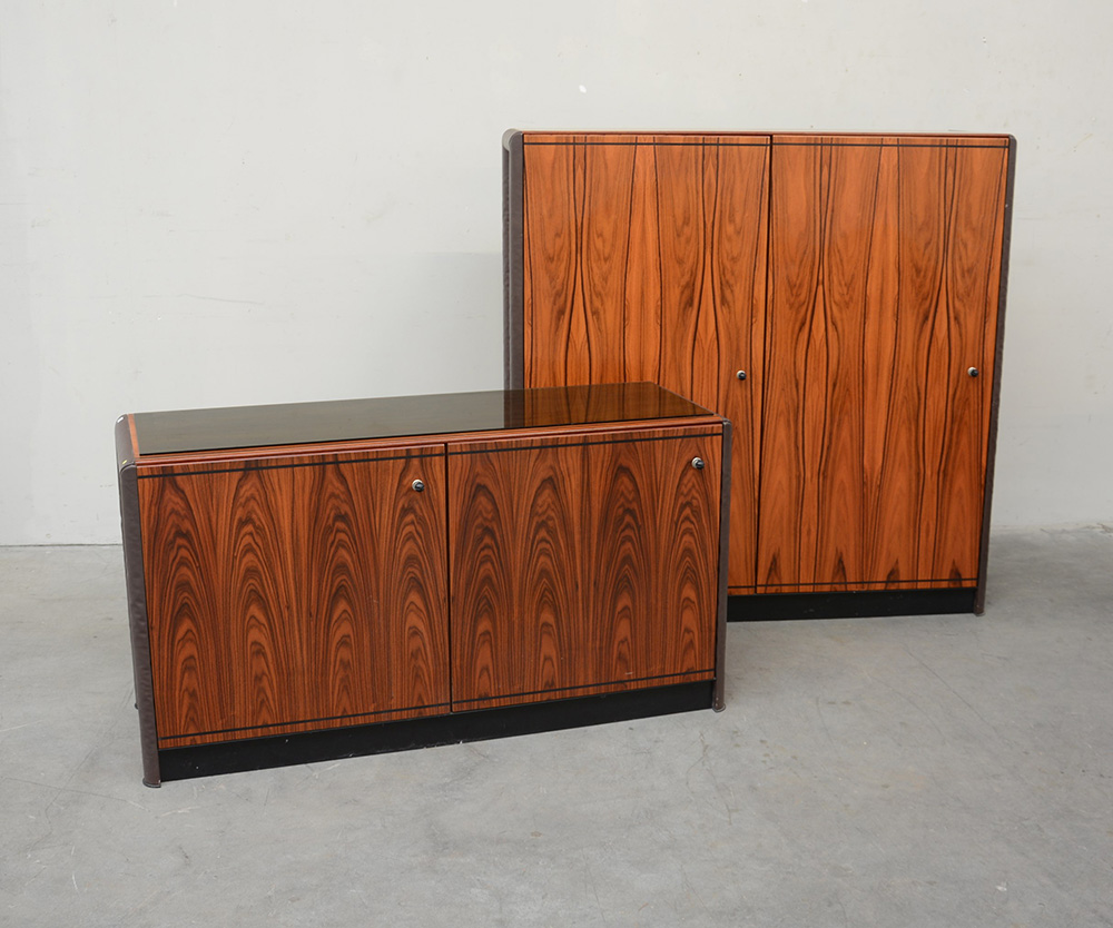 Fornitura composta da due credenze a due ante in palissandro d'india con profili in similpelle.