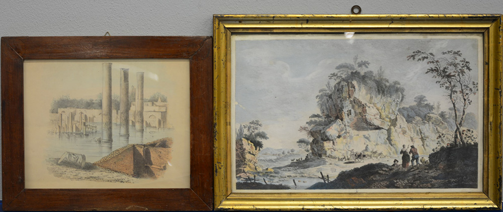 Lotto composto da due stampe a colori, soggetti e misure diverse, in cornice (difetti)