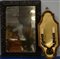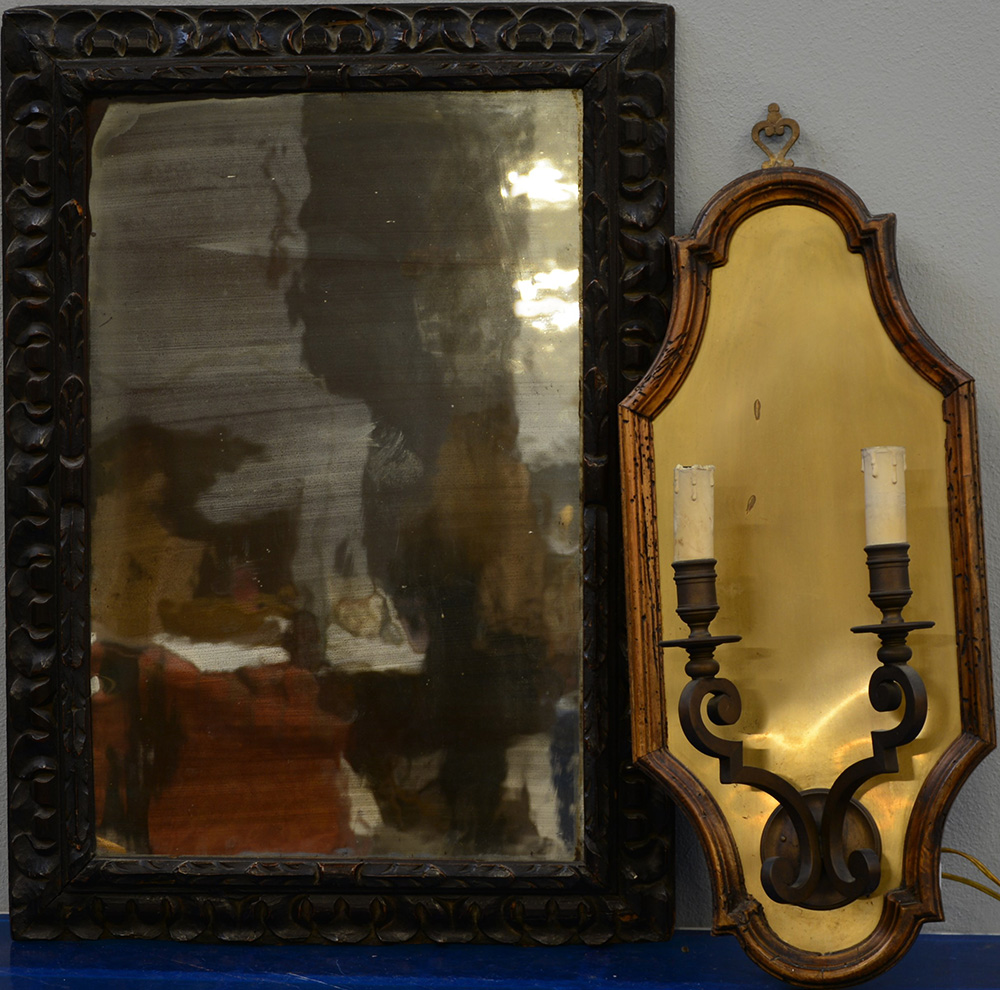 Lotto composto da una applique a due fiamme in bronzo con cornice in legno e una specchiera rettangolare con cornice in legno intagliato (difetti)