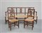Fornitura da portico composta da un divano a tre posti e due sedie in legno tinto con gambe rastremate, schienale a giorno e seduta in paglia intrecciata. Sec. XVIII (difetti)