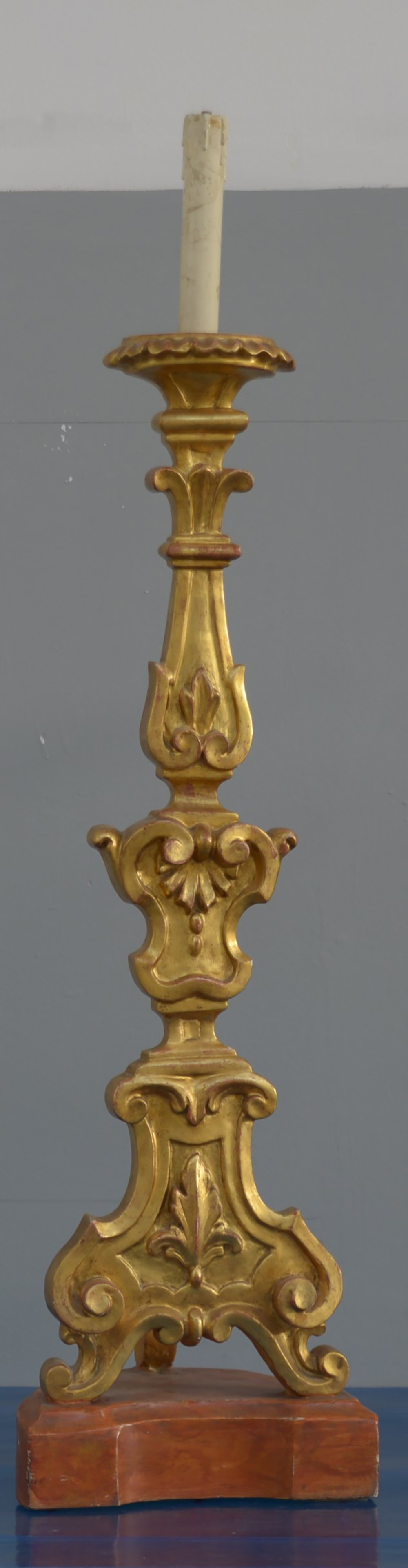 Candeliere di forma sagomata in legno intagliato e dorato su base dipinta a finto marmo (h cm 102) (difetti)