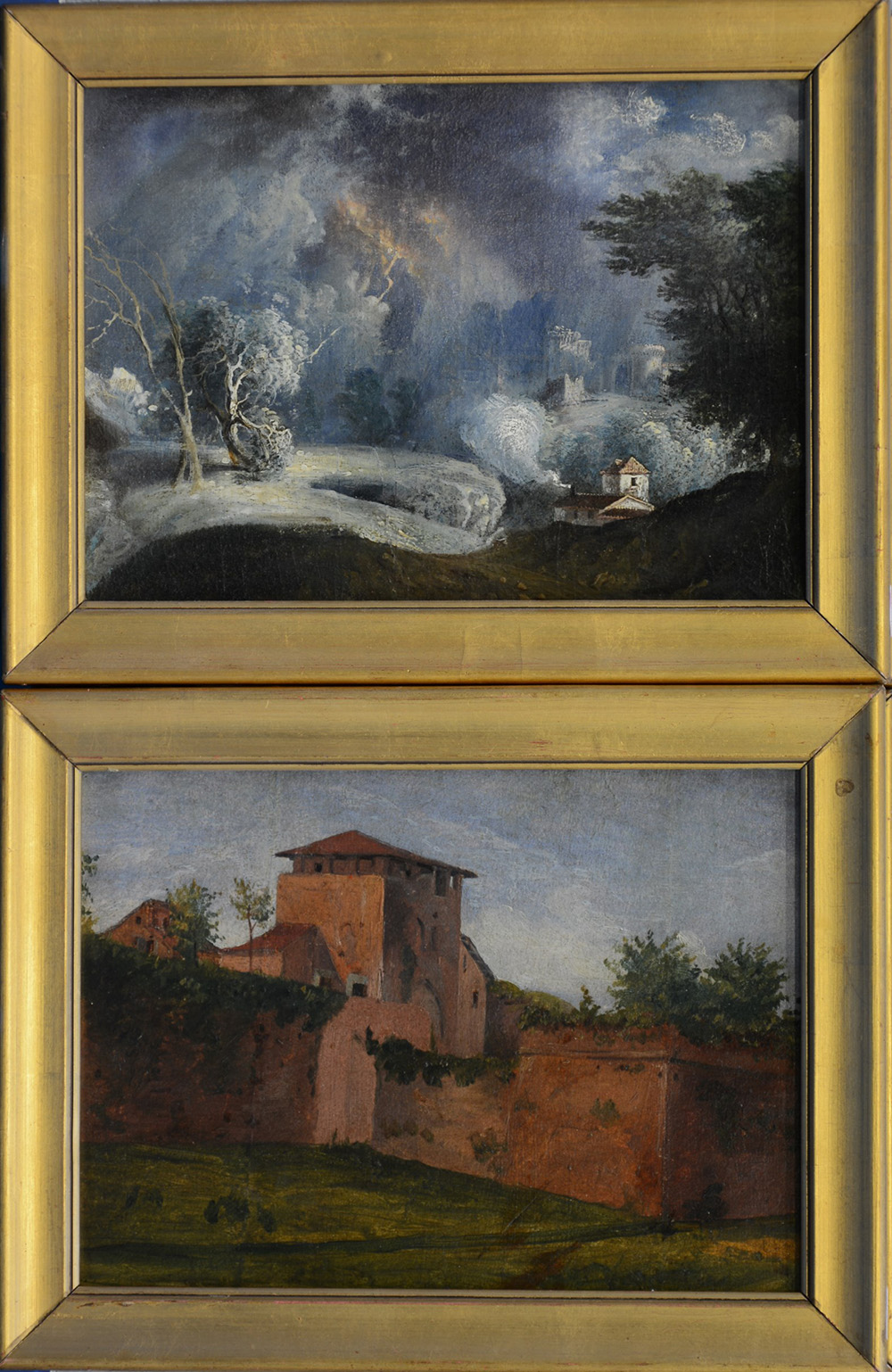 Scuola secolo XIX "Paesaggio invernale" e "Paesaggio con edificio medievale" coppia di dipinti su carta applicata su tela (cm 18x24) In cornici (difetti)