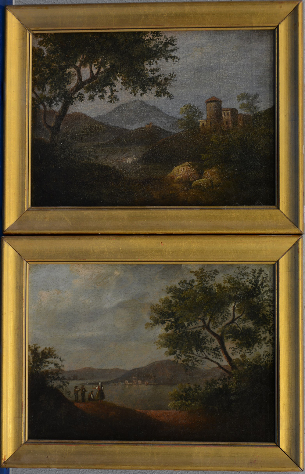 Scuola del secolo XIX "Scorcio di paesaggio lacustre" e "Paesaggio con torrione", coppia di dipinti su carta applicati su tela (cm 18x24) In cornici (difetti)