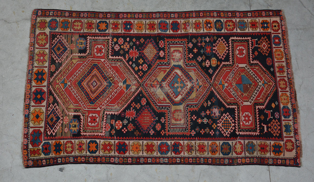[Tappeti] Tappeto Shirwan, Caucao, inizio sec. XX. Disegno a tre medaglioni nei toni del rosso, giallo e azzurro su fondo blu notte (cm 173x105)�� (difetti, restauri, sbavature e mancanze)