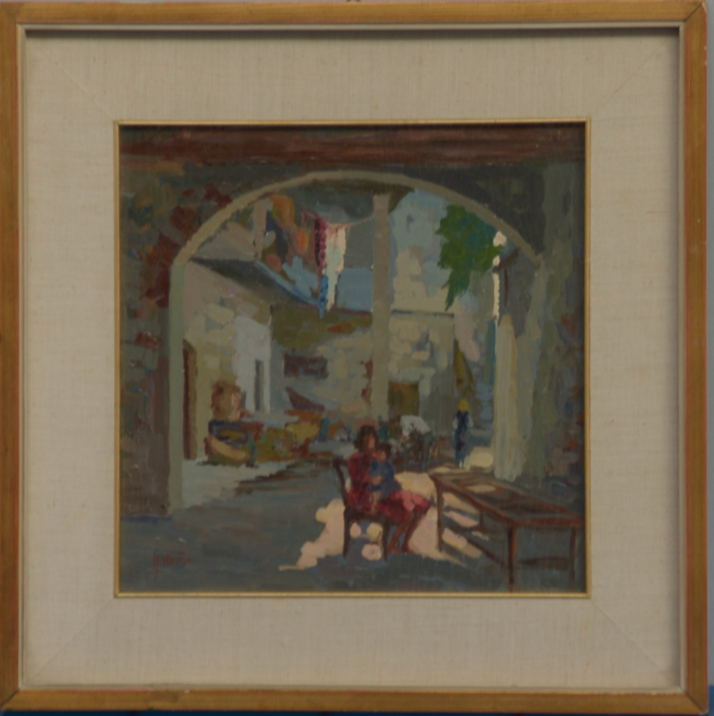 "Cortile di una casa a ponte di legno" olio su compensato (cm 32,8x32,5), firmato in basso a sinistra