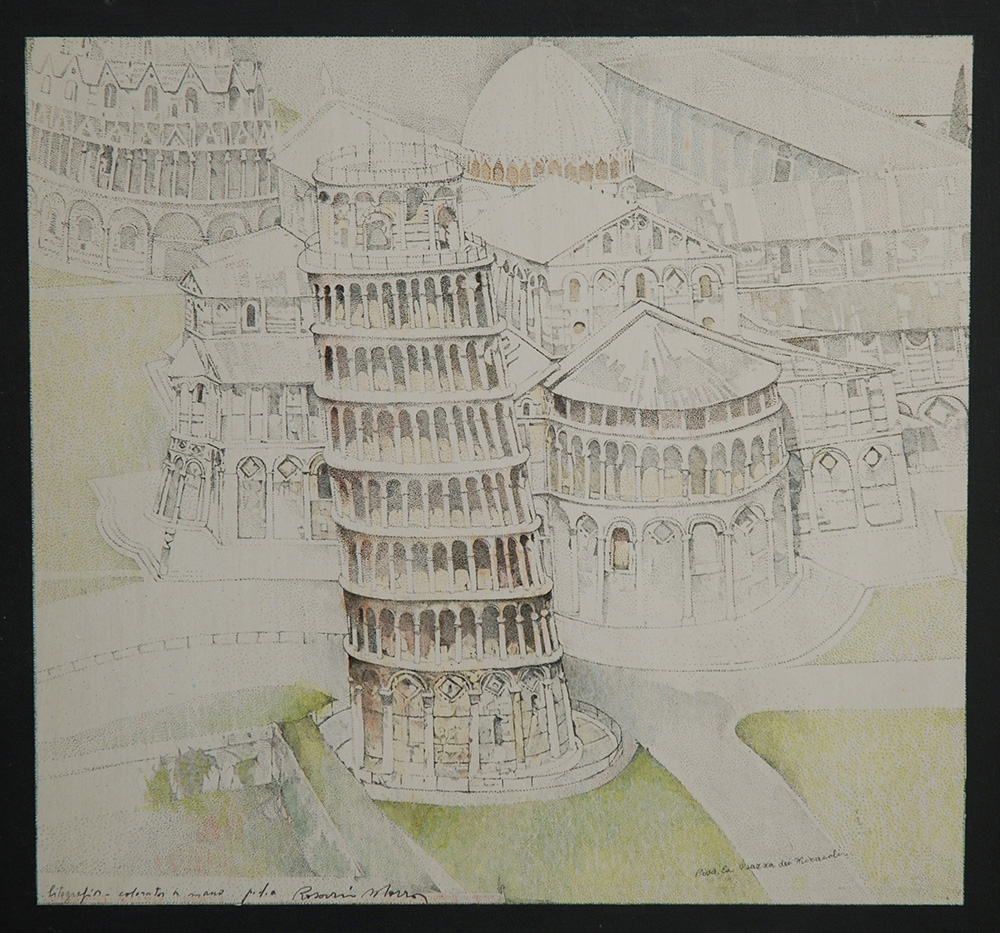 "Pisa, Piazza dei Miracoli" 1987 litografia su tavoletta colorata a mano (cm 27x29) Es. P.A. firmata e iscritta in basso e al retro