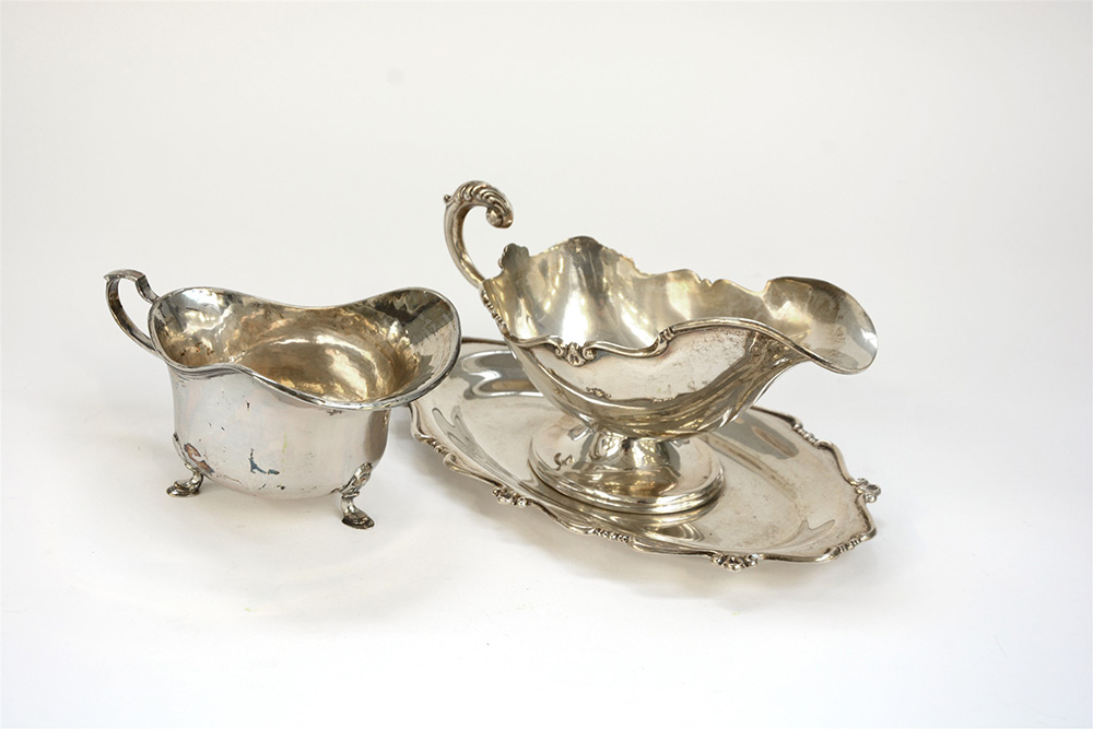 Due salsiere in argento. Italia, metà sec. XX (l. max cm 23,5) (gr tot 630 ca.) (difetti)